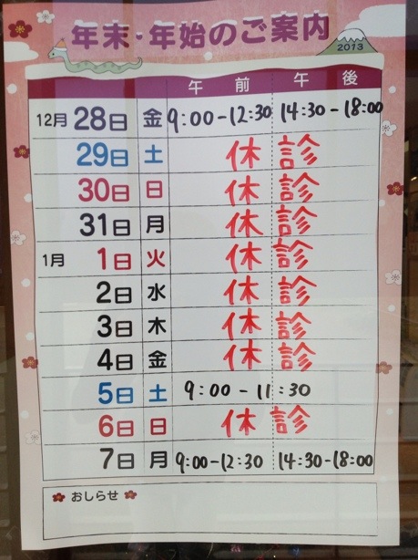 さて、年末年始休診のお知らせです。