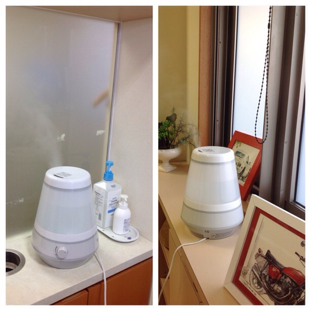フラワーアレンジメントと加湿器 可愛いフラワーアレンジメントが届いていますよ 雪だるまの顔にとっても癒されます。 加湿器作動の季節になりました。 今年から新しい加湿器1号2号がふるやしき歯科の診療室を潤すためにフルパワーで頑張ってくれています。 おかげで診療室の湿度は50%弱をキープしております。 空気が乾燥していると、のどの粘膜が乾燥し免疫力が低下します。風邪やインフルエンザウイルスにも感染しやすくなります。 うまく加湿をしてこの冬を乗り切りましょうね!
